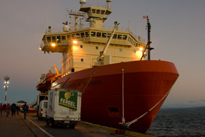 By 4:30, we were on our way to the dock on foot, and the sun had set. I snapped this picture of my first in-person look at the Nathaniel B. Palmer. Up close, it is comfortingly big. There on the dock, a happy reunion took place, of scientists happy to see their delayed colleagues. Our arrival meant everyone could finally begin to make better progress on the hard, frenzied work of getting the scientific and lab equipment offloaded, unpacked, inspected, and arranged — all of which must happen before we can leave port.